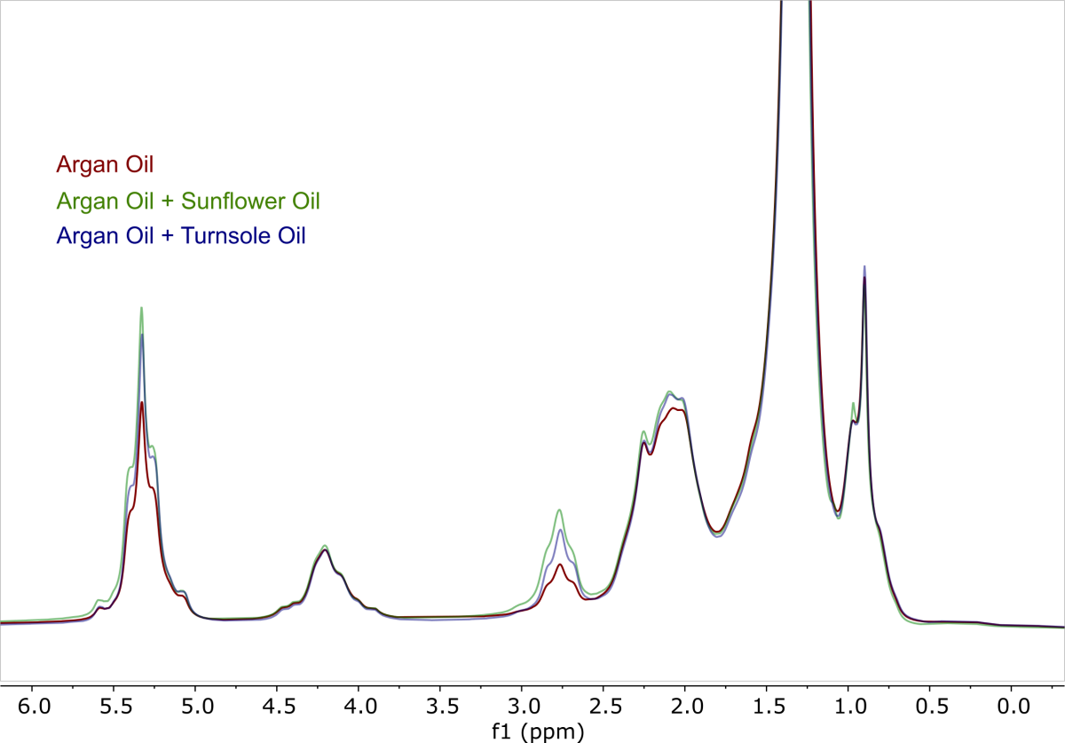 ¹H NMR spectra of pure argan oil, and two adulterated samples showing the clear spectral differences that allow rapid identification of adulterated argan oil using it’s fatty acid profile.