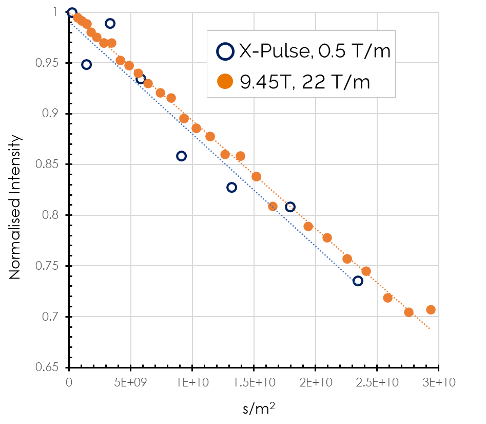 The materials being considered for this application range from polymers to ceramics with a diverse span of expected lithium diffusion coefficients and conductivities. One example is argyrodites which are sulfide-based lithium-ion superconductors with high ionic conductivity at room temperature. These are currently being commercialised by companies including BASF. We have recently measured lithium diffusion in these compounds using the X-Pulse benchtop NMR, with very good agreement with high-field solid state NMR. Using both techniques diffusion coefficients of (5.9±0.7)×10−12 m2.s−1 were obtained.