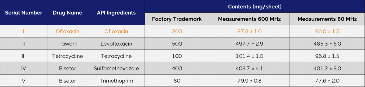 Table 1 shows the results of the measurements of the quantity of APIs for five typical small molecule pharmaceuticals. One-dimensional 1H spectra were collected on high-field and low-field nuclear magnetic resonance spectrometers, and API contents of the five pharmaceutical raw materials quantified, using chloroform as an internal standard. Values obtained for all the analysed drugs were comparable whether obtained using a high field spectrometer or on the benchtop. Moreover, in both the 600 MHz and 60 MHz evaluations, the serial number I drug measurements were approximately half of the manufacturer's claimed value, clearly demonstrating the ability of benchtop NMR to detect an inferior product.