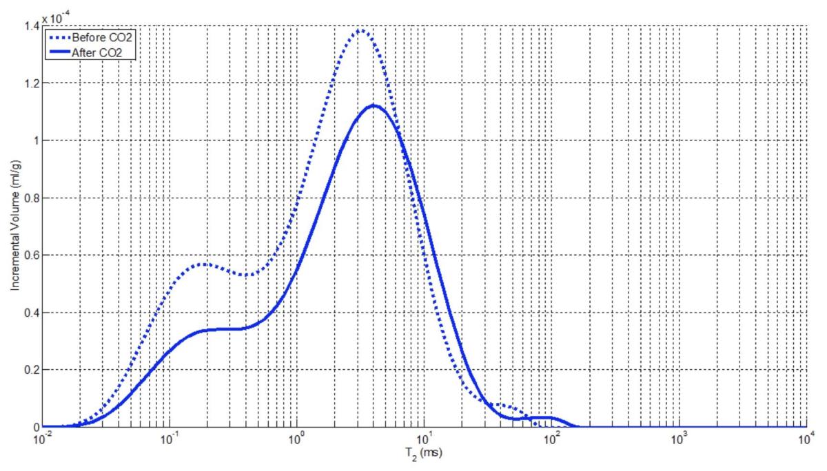 All the same experiments employed in NMR core analysis can be helpful to evaluate potential carbon storage projects. For example, NMR T2 based porosity and pore size distribution measurements can be used to determine the carbon storage capacity in rocks. In a recent collaborative study with the Kelly Research Group from Columbia University, we used NMR T2 data to augment a carbon mineralization study in igneous rocks. Below is a figure which shows a T2 distribution of a rock before and after a carbonized brine flood. The decrease in NMR signal after the flood, suggests that the carbon in the brine is reacting with the rock matrix and builds a carbon-based mineral in the rock.