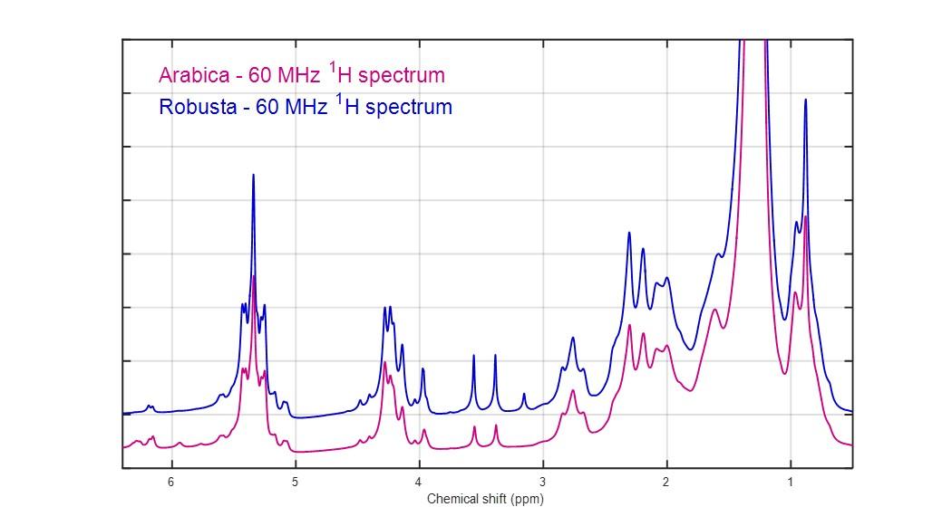Kate Kemsley’s group then examined benchtop NMR spectroscopy to see whether it could offer a solution for fraud detection in the coffee sector. Nearly all commercial production derives from just two different species of coffee. Arabica is the most in-demand, but it is harder to grow, while Robusta delivers higher yields but has limited sensory properties meaning it is used in lower-grade coffee products.