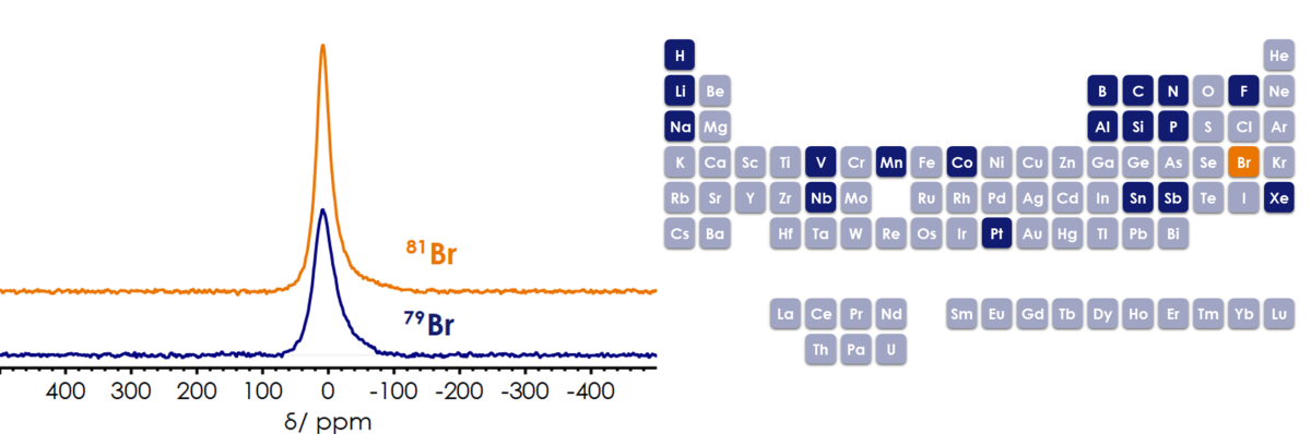 The X-Pulse with a fully tuneable broadband (X-)channel has been proven to be capable of observing many NMR active nuclei over a broad range of frequencies. So far, the nuclei shown in dark blue in the periodic table have been measured on the X-Pulse with the convenience and ease of use of a benchtop system. When it comes to Bromine, solid-state NMR is primarily used in research due to the reason that both bromine isotopes (79Br and 81Br) are quadrupolar (S= 3/2) that yield broad signals, which sometimes are hardly detectable with high-resolution spectrometers, even in the small molecules. However, both nuclei have an excellent natural abundance of around 50% and resonance frequency quite similar to 13C (Frequency of 13C @1.4T =15.01 MHz). Some properties of both bromine isotopes are listed in table 1. Given this information, we aimed to run Br NMR on our 60 MHz X-Pulse system, using a 3 mol/l solution of KBr in D2O. Both isotopes result in a resonance at a chemical shift (δ) of 8.57 ppm and a linewidth (ν½) of 539 and 395 Hz for 79Br and 81Br, respectively. As shown in Figure 1, 81Br appeared slightly narrower than 79Br which can make it a nucleus of interest in solution NMR. Therefore, we can add 79Br/81Br (in orange colour in the periodic table) to the list of nuclei that have been demonstrated to be observable on the X-Pulse.