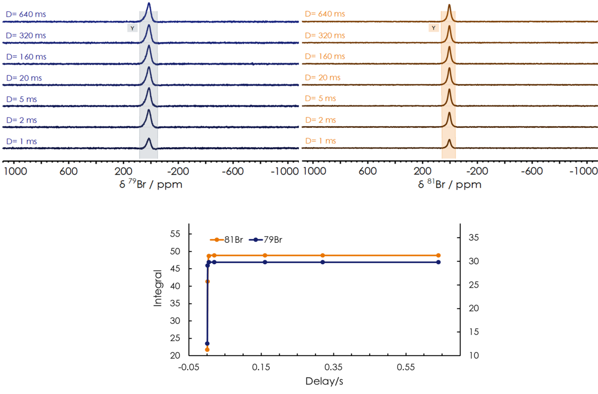 Next, the spin-lattice (or longitudinal) relaxation time (T1) and spin-spin (or transverse) relaxation time (T2) of both bromine isotopes were obtained using Inversion Recovery (InvRec) and spin-echo (CPMG) pulse sequences, respectively, revealing very short relaxation time for both nuclei, as summarised in Table 2. For the calculation of T1, an array of InvRec experiments were performed while varying the recovery time parameter ranging from 1 - 640 ms, followed by fitting the signal integrated area to an exponential equation shown in Figure 2. After having T1 optimized, we can safely run quantitative bromine measurements on the X-Pulse. T2 relaxation time was also obtained by collecting an array of CPMG experiments keeping a constant echo time (τ) while varying the number of echoes. The resulting attenuation of the signals is fitted to an exponential equation depicted in Figure 3, to obtain T2.