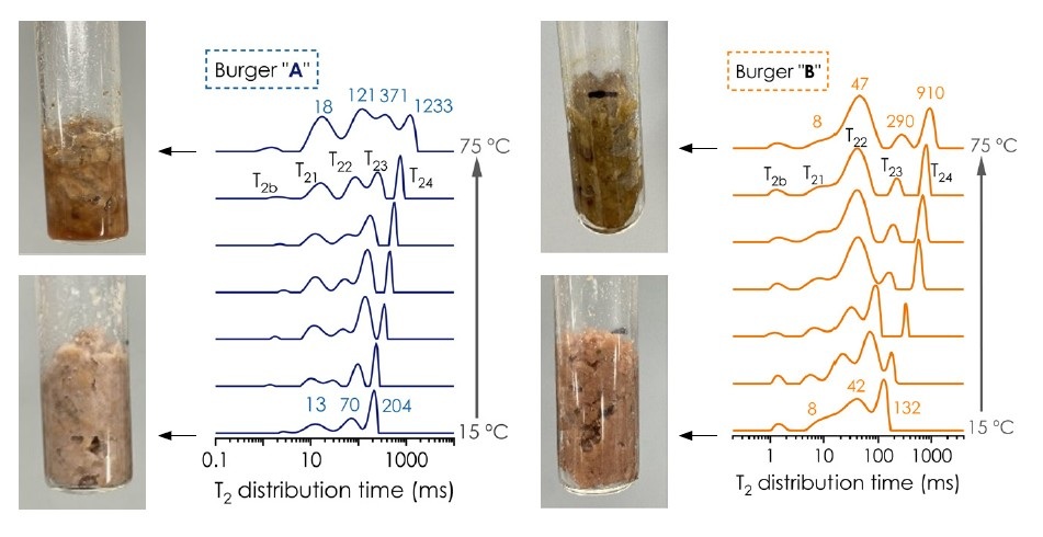This study investigated the water and fat distribution of two soya-based burgers under heating conditions (15 - 75ºC) using MQC-R and a 1H 18 mm liquid variable temperature probe. Nutrition information per 100 g of each burger is compiled in Table 1. The raw CPMG (T2) decays were acquired on both samples and then processed using a1D inverse Laplace transformation (ILT).